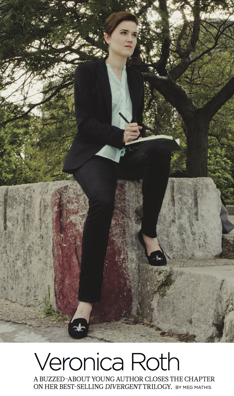 Con una adaptación de la película Divergente que estará en la gran pantalla en cinco meses (producida por Summit Entertainment, una compañía Lionsgate, el debut de la película está previsto para 21 de marzo 2014), Roth tiene mucho para vivir "Es muy emocionante y muy extraño" ella se ríe. El reparto consta de Shailene Woodley como Tris y Kate Winslet como Jeanine Matthews, la película fue filmada exclusivamente en Chicago, en lugares como Pioneer Corte de Michigan Avenue, la rueda de la fortuna de Navy Pier y el Cinespace de Chicago Film Studios. "Todo tiene un aspecto familiar", dice Roth, "Pero es una cosa totalmente diferente verlo en la vida real, con personas reales caminando en este mundo que he construido". No es que ella tendría de otra manera. "Estoy haciendo exactamente lo que quiero hacer", dice Roth, cuyo plan es ver a donde su escritura la lleva, después de que ella conquiste la cocina, por supuesto.